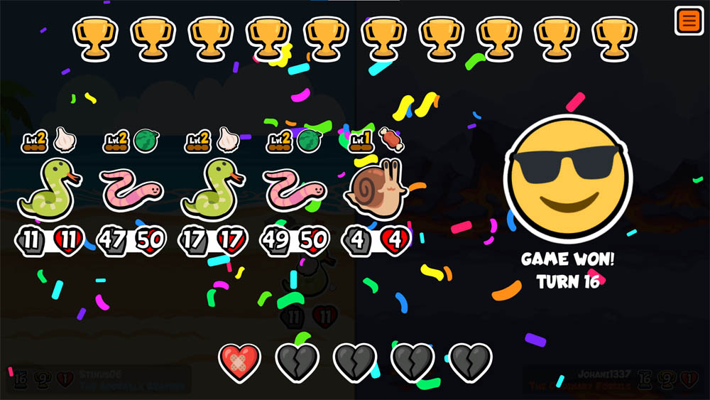 | 09 Sep 2025 | 2 | 2 | 2 | End turn: If you lost last battle, give the three nearest friends ahead +1 attack. | End turn: If you lost last battle, give the three nearest friends ahead +2 attack. | End turn: If you lost last battle, give the three nearest friends ahead +3 attack. |